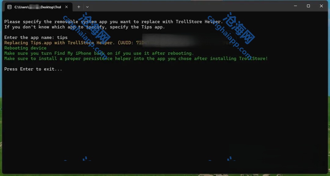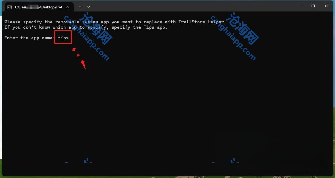 接着手机数据线连接电脑。打开 TrollRestore 这里要注意,是先手机连接电脑以后,再打开TrollRestore ,然后看上图再后面输入tips 点击一下回车键 手机上面如果没有提示,记得提前下载一个提示,打开或者不打开都行。操作的时候手机不要熄屏