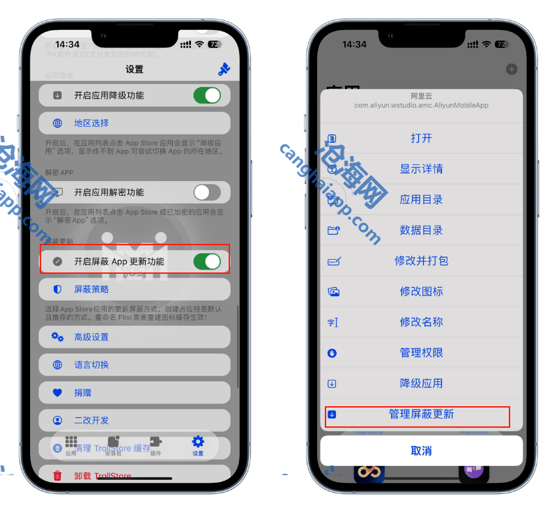3. 新增App更新屏蔽功能:在设置页可开启该功能,开启后支持选择两种屏蔽方式;屏蔽后点击对应应用可恢复更新(注:使用创建占位符屏蔽时,点击更新会无法执行;使用重命名屏蔽策略时,会显示小云朵标识)。
