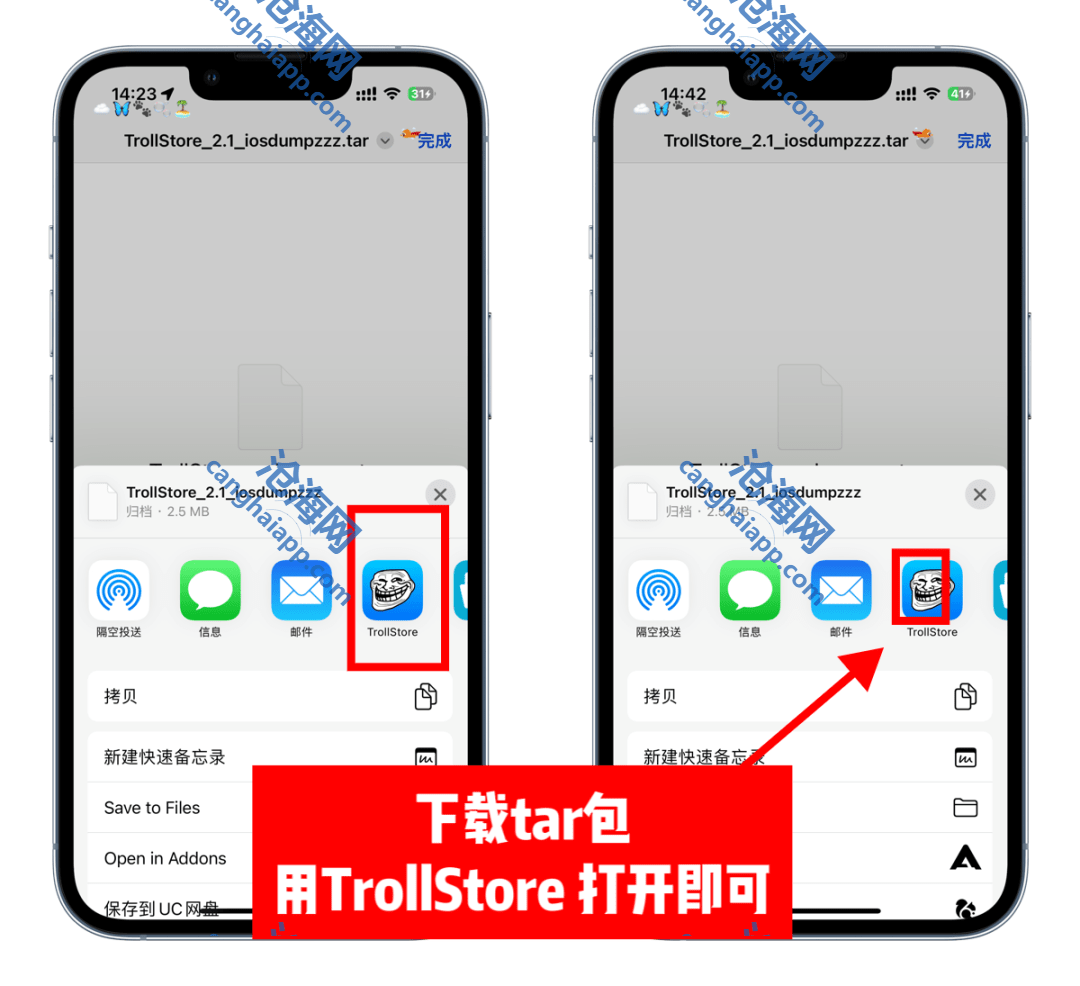 ?下载tar包之后,用TrollStore打开,如果为.json后缀,就先重命名删除【.json】再操作