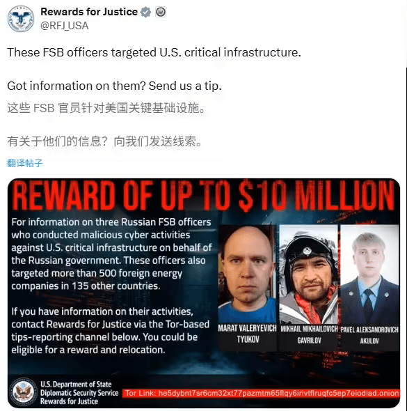 9 月 6 日消息,美国国务院 9 月 3 日宣布将通过“Rewards for Justice”计划发布 1000 万美元(IT之家注:现汇率约合 7132.8 万元人民币)悬赏,征集三名俄罗斯黑客相关信息。
