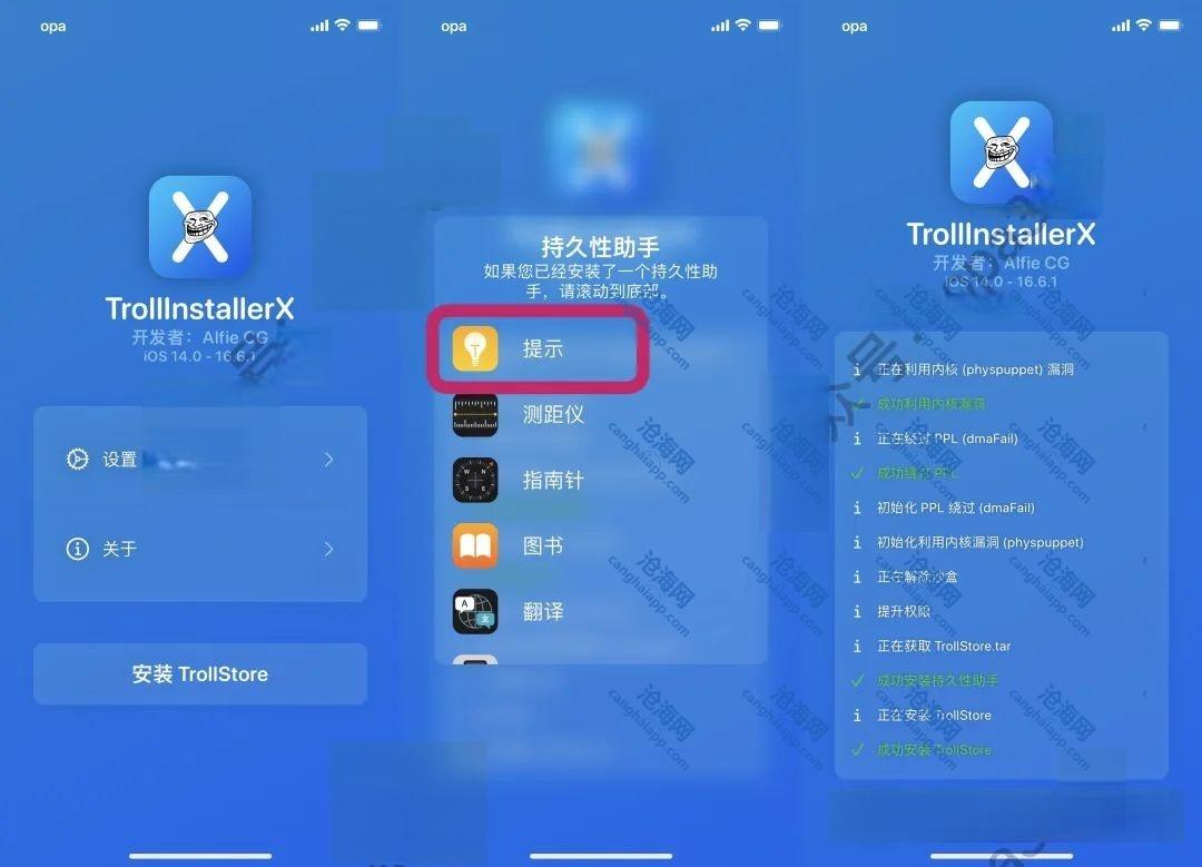 间接安装:和之前的方法一样的过程,先注入,再打开手动安装TrollStore,再安装持久性助手!