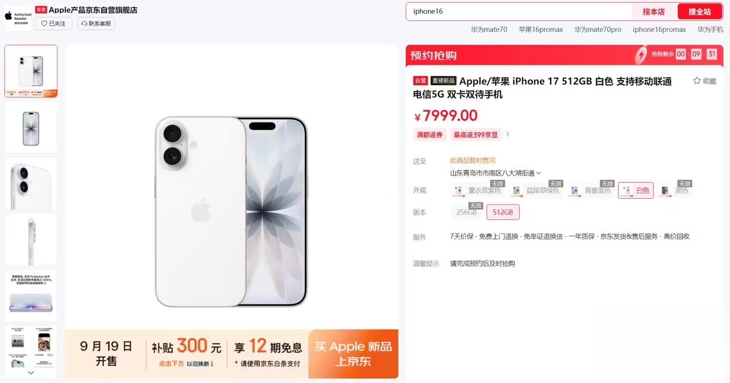 此外,京东等电商平台官方店均已显示 iPhone 17 系列无货。