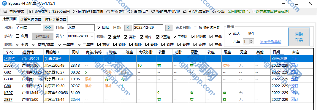 Bypass分流抢票绝对的电脑端抢票利器,软件可以说小巧,但不失强大;支持全程自动抢票,自动抢候补,自动识别验证码,多线程秒单、稳定捡漏,支持多天、多车次、多席别、多乘客等功能,可以直接挂机自动抢票。