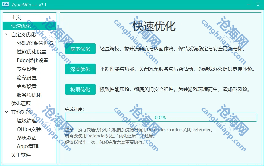 ZyperWin++是一款轻便的Windows优化工具,支持从 Win7 到 Win11 的所有最新版本系统。别看它仅有 2MB 大小,却集性能优化、服务项优化、垃圾清理等多种强大功能于一身,操作简单,效果显著。