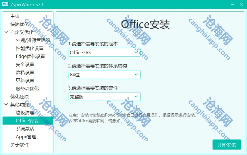 Office管理:支持自定义安装Office各个版本,用户可选择所需的版本和套件快速完成安装。