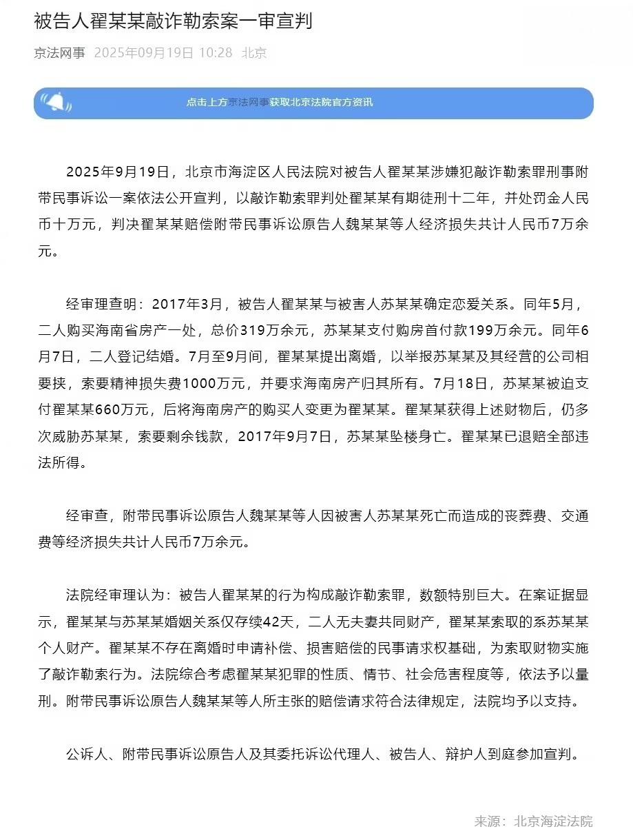 9 月 19 日消息,“京法网事”公众号今天发布博文,报道称 2025 年 9 月 19 日,北京市海淀区人民法院对被告人翟某某涉嫌犯敲诈勒索罪刑事附带民事诉讼一案依法公开宣判,以敲诈勒索罪判处翟某某有期徒刑十二年,并处罚金人民币十万元,判决翟某某赔偿附带民事诉讼原告人魏某某等人经济损失共计人民币 7 万余元。