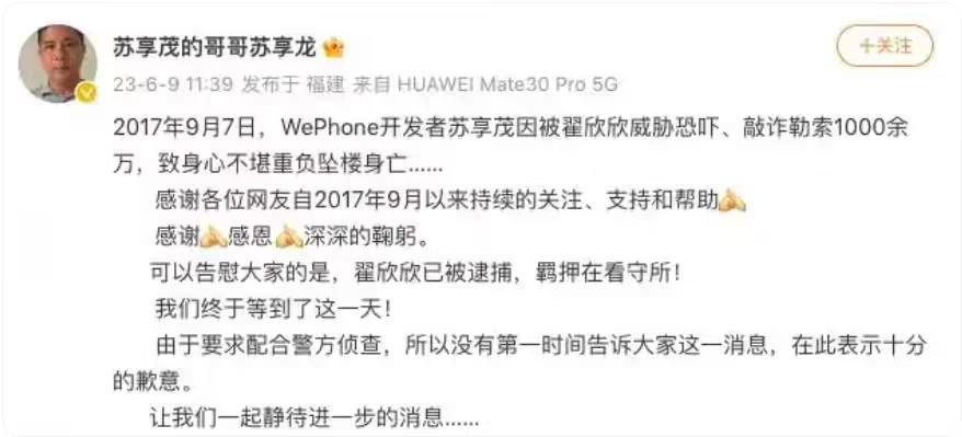 2017 年 9 月 7 号凌晨 3 点 46 分,苏享茂在自己研发的产品 WePhone 推送了一条“公司法人被毒妻翟某害死,WePhone 即将停止运营”的消息后,凌晨 4 点多,从西二旗的家中跳楼自杀。