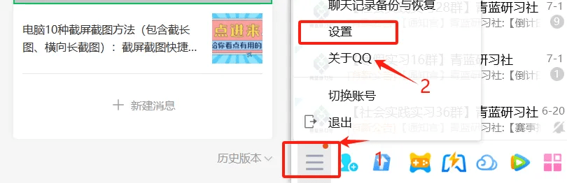 因为快捷键有时候因为一些设置功能会发生冲突,无法使用,这时候我们可以进行自定义或者修改快捷键,如下图,登录QQ点击左下角的三条杠,点击设置;