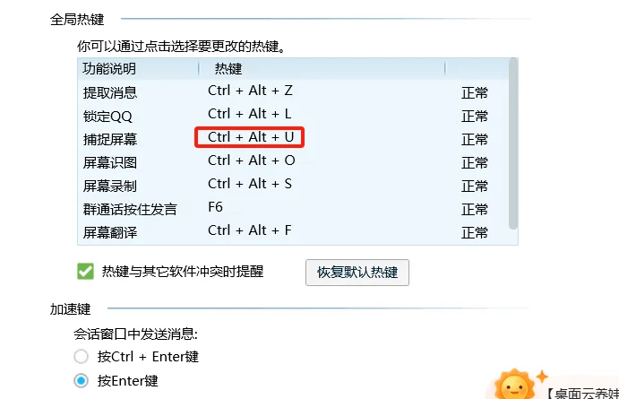 进入就是以下的图,界面,这时候如果有无法使用就可以看到后面的正常或者冲突,因为我的截图快捷键冲突了,我直接点击修改成了Ctrl+Alt+u。