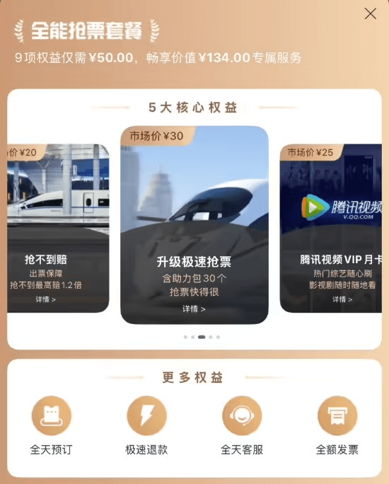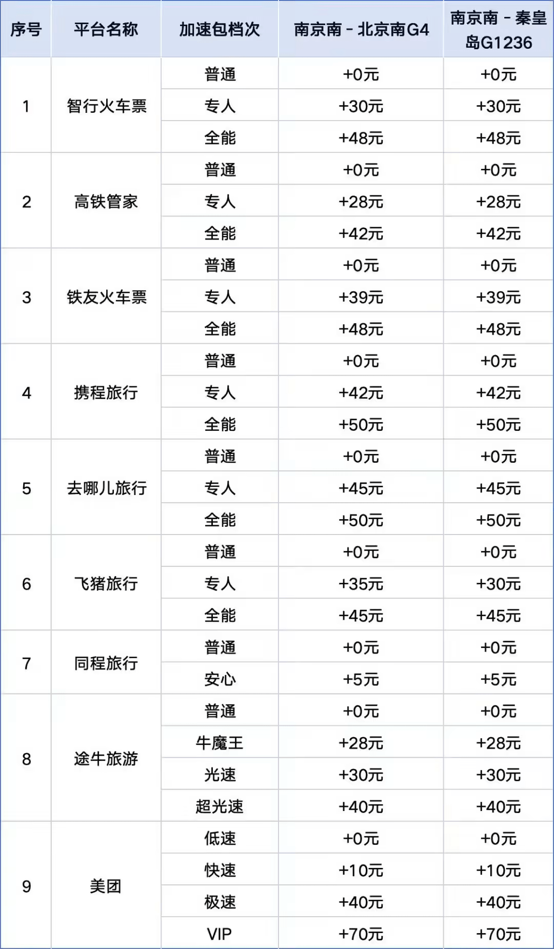 IT之家注意到,携程、去哪儿、飞猪等平台的“加速包”现在已经改为“全能抢票”“放心抢票”等服务,价格从 48 元至 60 元不等。