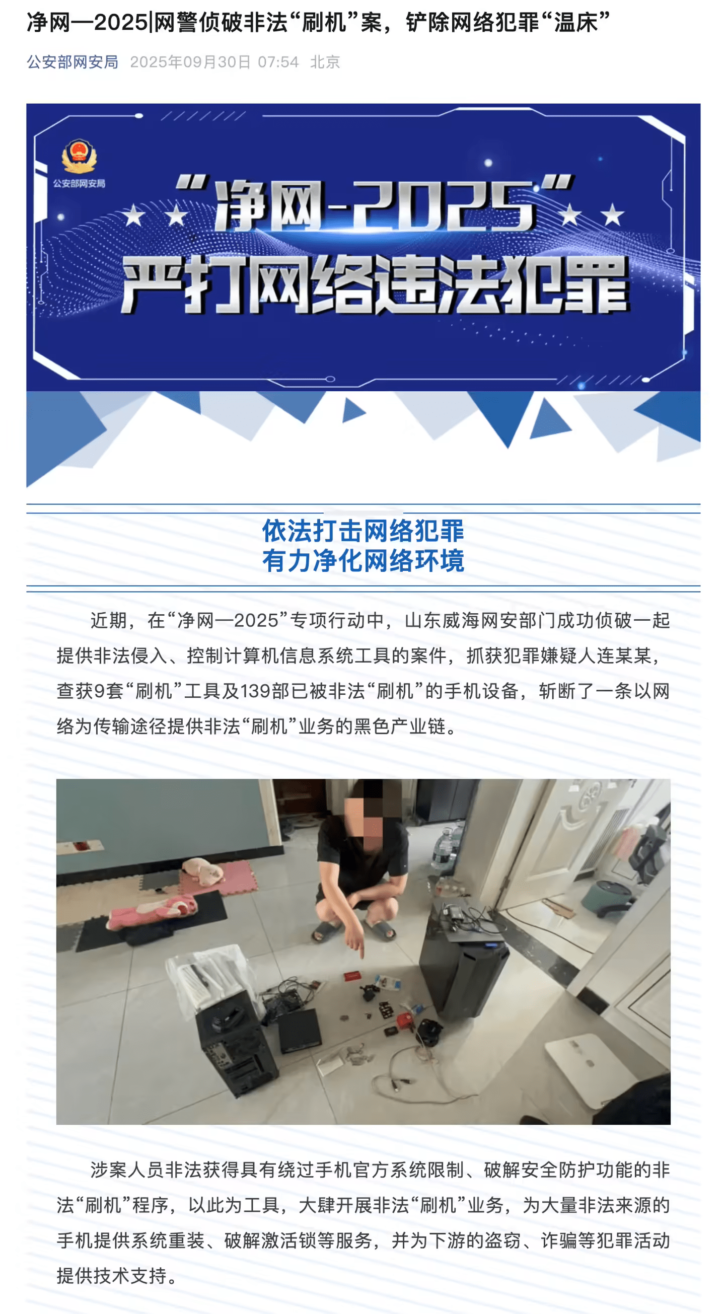 9 月 30 日消息,公安部网安局今日发文通报,在“净网 —2025”专项行动中,山东威海网安部门成功侦破一起提供非法侵入、控制计算机信息系统工具的案件,抓获犯罪嫌疑人连某某,查获 9 套“刷机”工具及 139 部已被非法“刷机”的手机设备,斩断了一条以网络为传输途径提供非法“刷机”业务的黑色产业链。