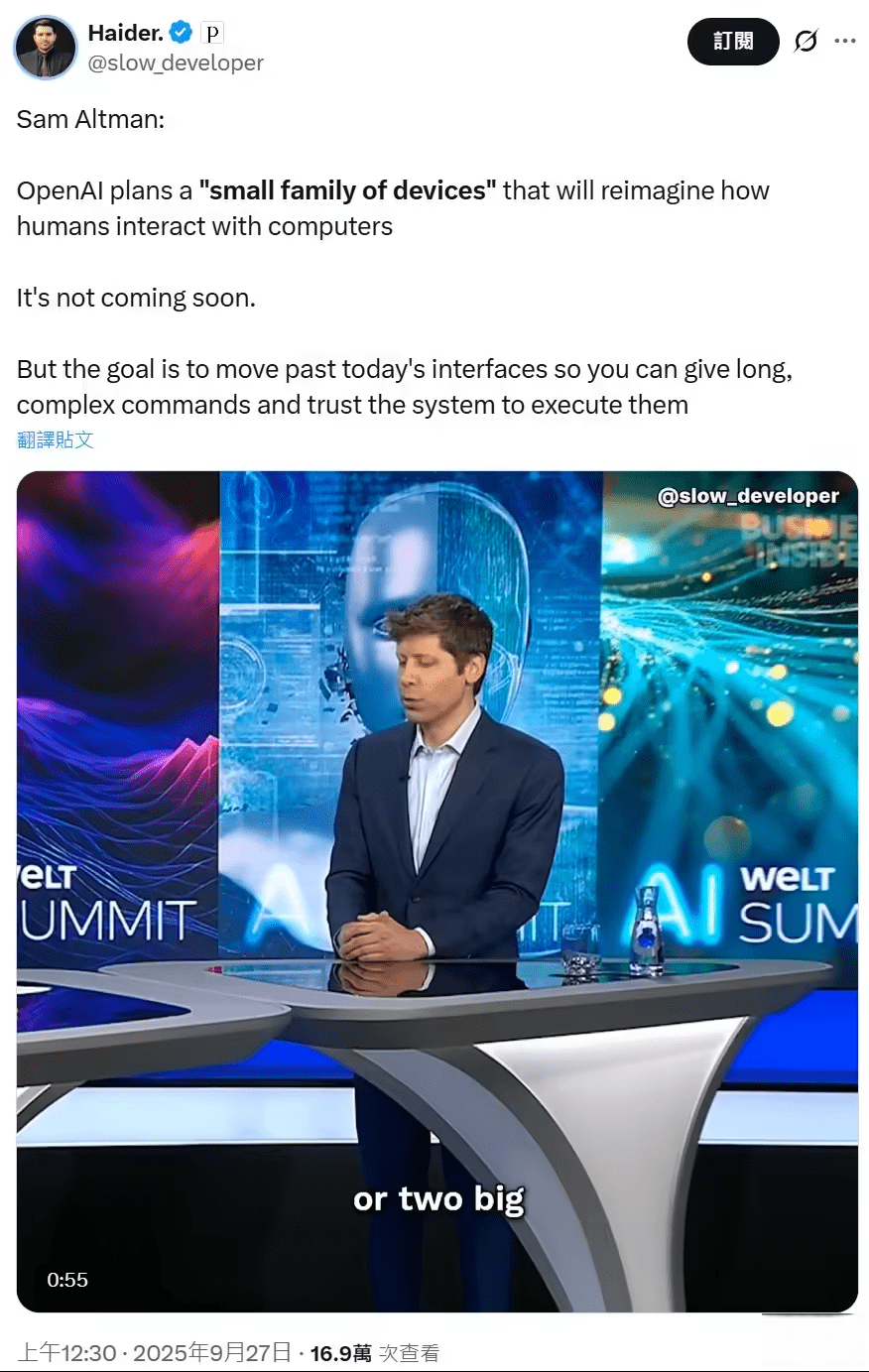 这名 CEO 还透露,OpenAI 正在探索硬件领域,研发出的产品将重新定义人们使用电脑工作、娱乐和生活的方式,不过研发还处于早期阶段,不能指望很快就出结果。他还表示,OpenAI 将打造一个“小型化硬件家族”,这些设备的外观将十分精美,还可以帮助人们更好地使用 AI。