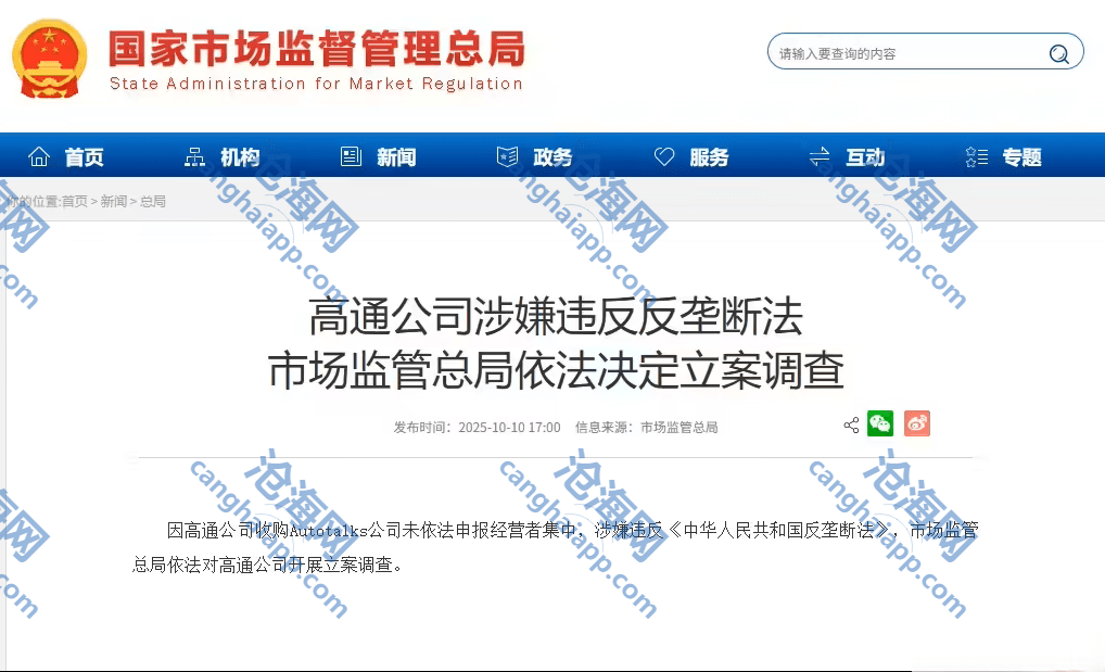 10 月 10 日消息,国家市场监督管理总局今日宣布,因高通公司收购 Autotalks 公司未依法申报经营者集中,涉嫌违反《中华人民共和国反垄断法》,市场监管总局依法对高通公司开展立案调查。