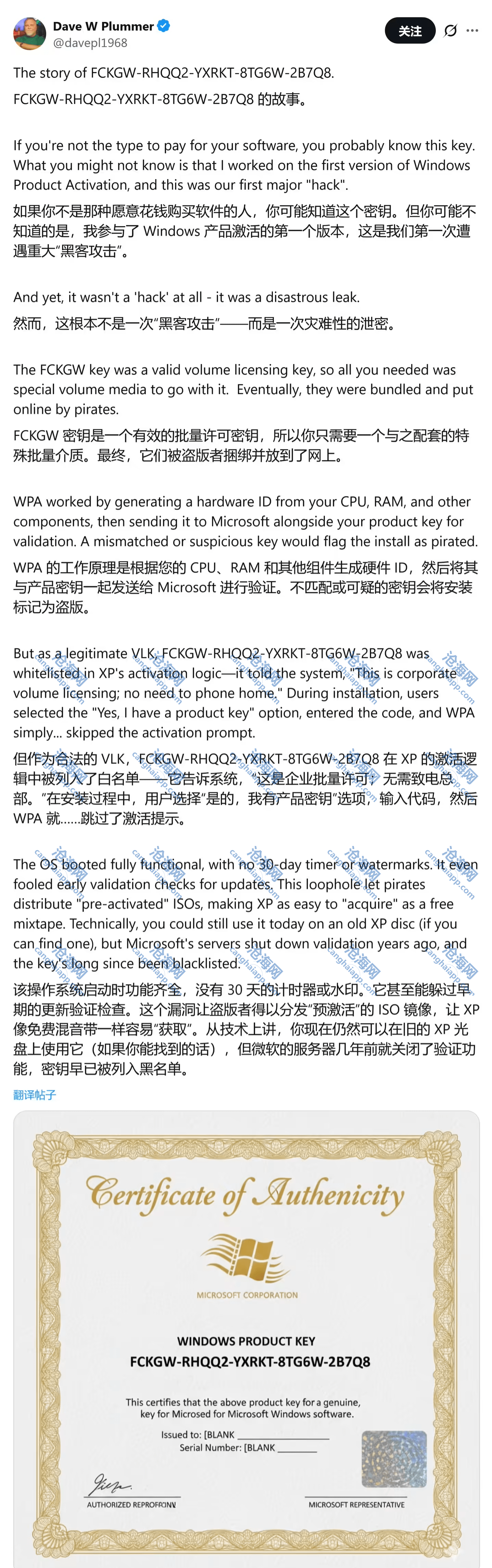 普拉默也提醒,该密钥在多年前就已被微软列入黑名单,并在 Windows XP SP1 及之后的版本更新中彻底失效。