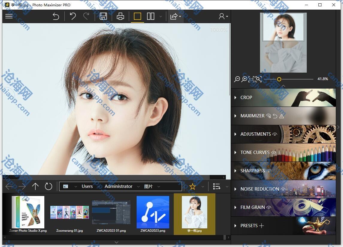 超强大的变焦功能,可将图像放大达1000%。通过 7 种缩放算法,Photo Maximizer 可以告诉您图像的目标尺寸(以像素或厘米为单位)。还可以调整所需的分辨率,以获得完美的结果。这在打印照片时尤其重要,可以保证您获得最高质量的结果。