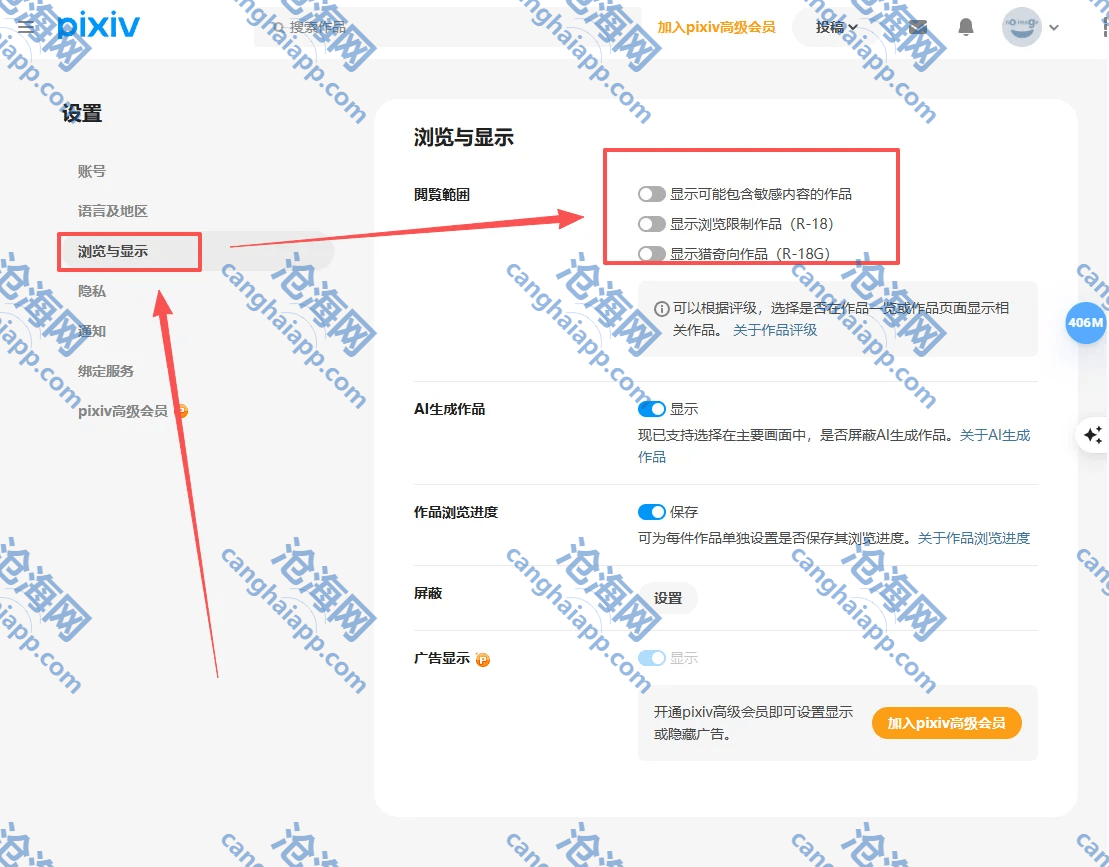 第四步:进入首页,点击网页右上角的个人头像旁的向下箭头,在菜单里选择“设置”;出现“用户设置界面”,在“浏览设置”栏找到“限制浏览的作品”和“怪诞作品”,勾选“显示作品”后保存。最后返回首页,页面右边就会新出现 18 选项,点击就可以看到相关内容。