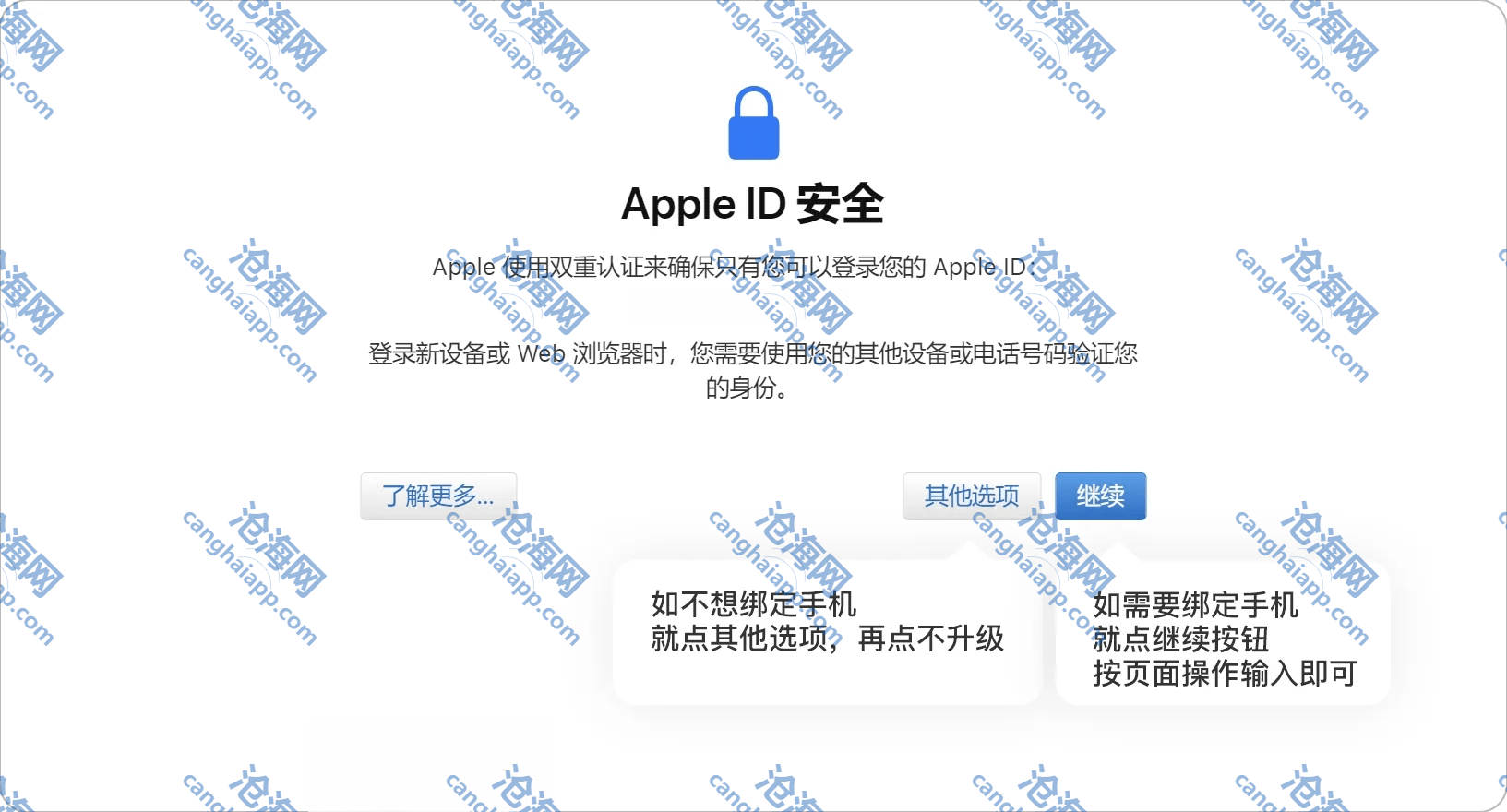 - 关于Apple ID安全提示:登陆出现Apple ID安全提示,也就是提示双重验证,点【其他选项】,再点【不升级】跳过就好,如下图所示;(先不要绑定,要绑可以改了密码密保在绑定手机号)