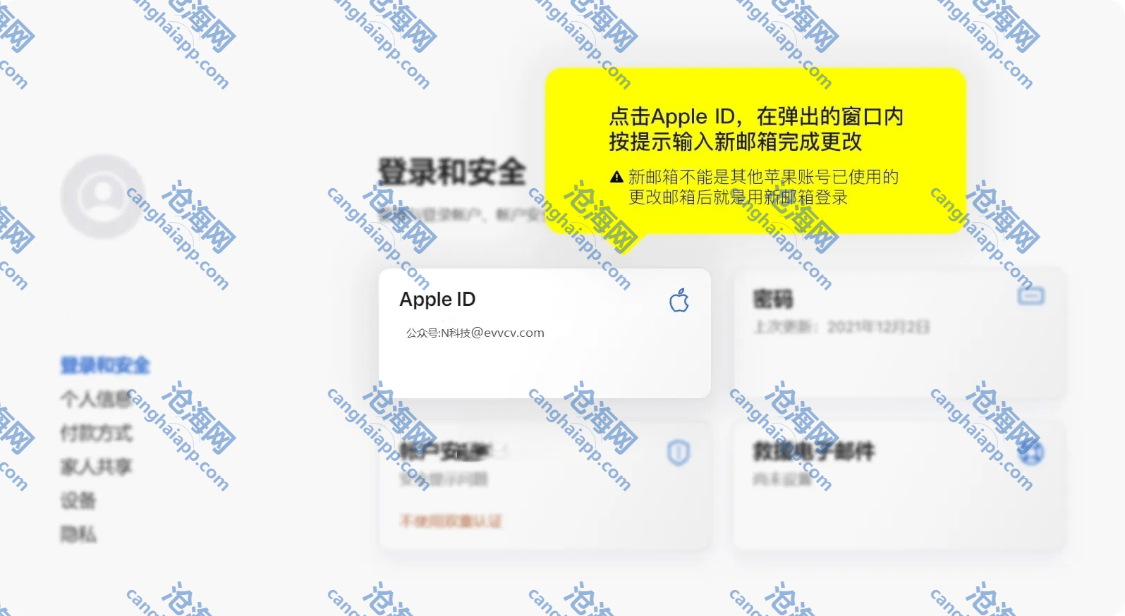- 点击【Apple ID】即可更改邮箱(很重要);注意:邮箱不能是其他苹果账号已经使用的,否则会提示不能使用;邮箱更改成功后,此苹果账号就是用新邮箱登录,跟原来的旧邮箱没有任何关系了