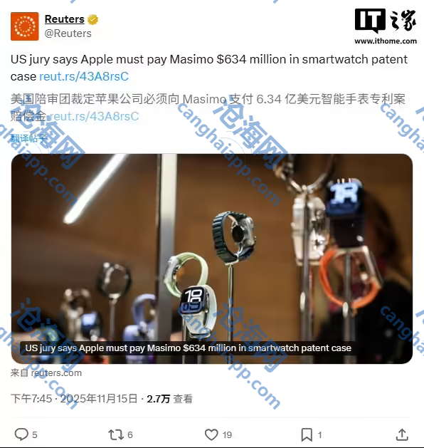苹果方面表示不同意判决结果,并将提出上诉。Masimo 在声明中称,这一裁定是“我们持续努力保护自身创新与知识产权的重要胜利”。