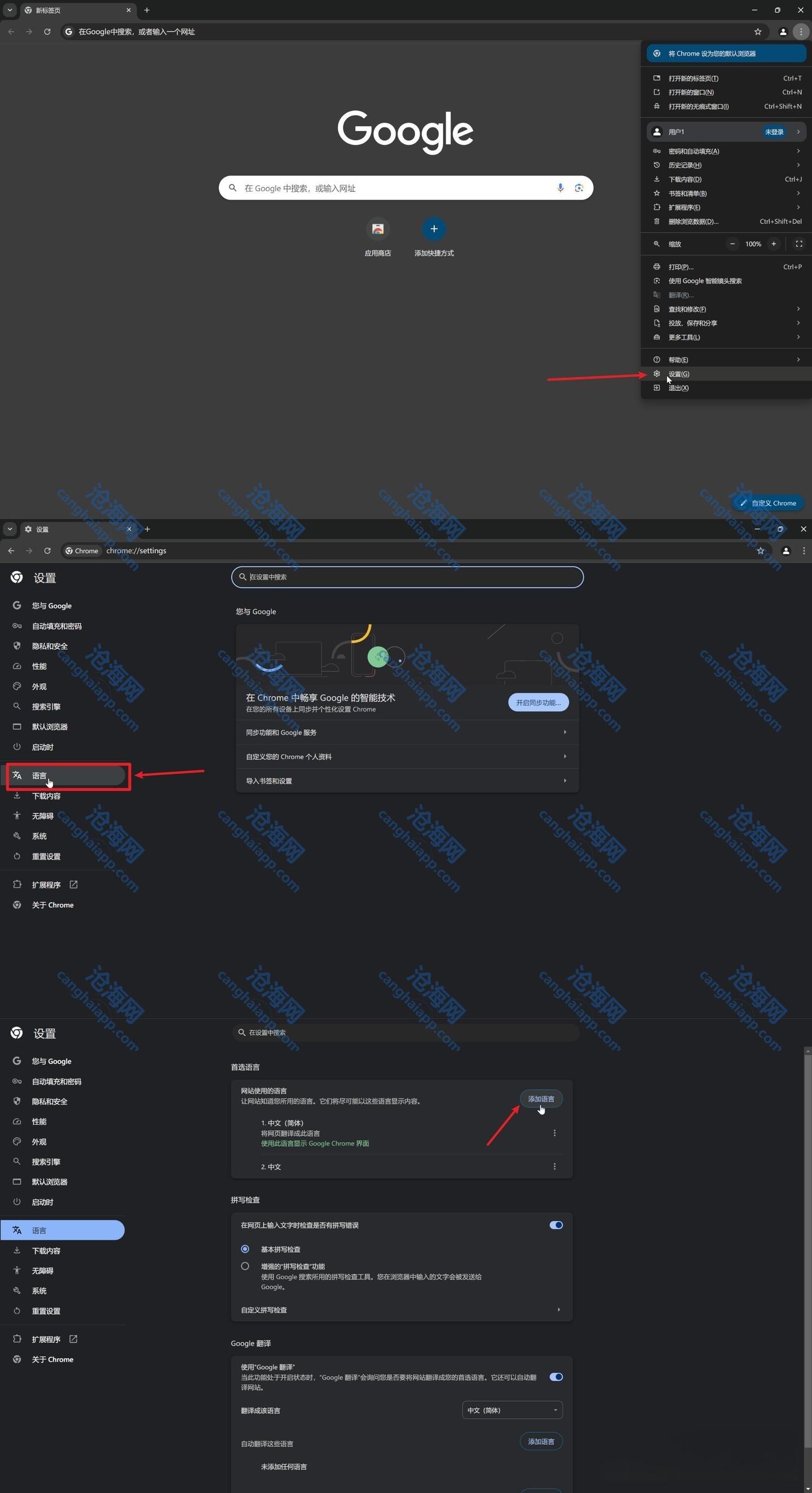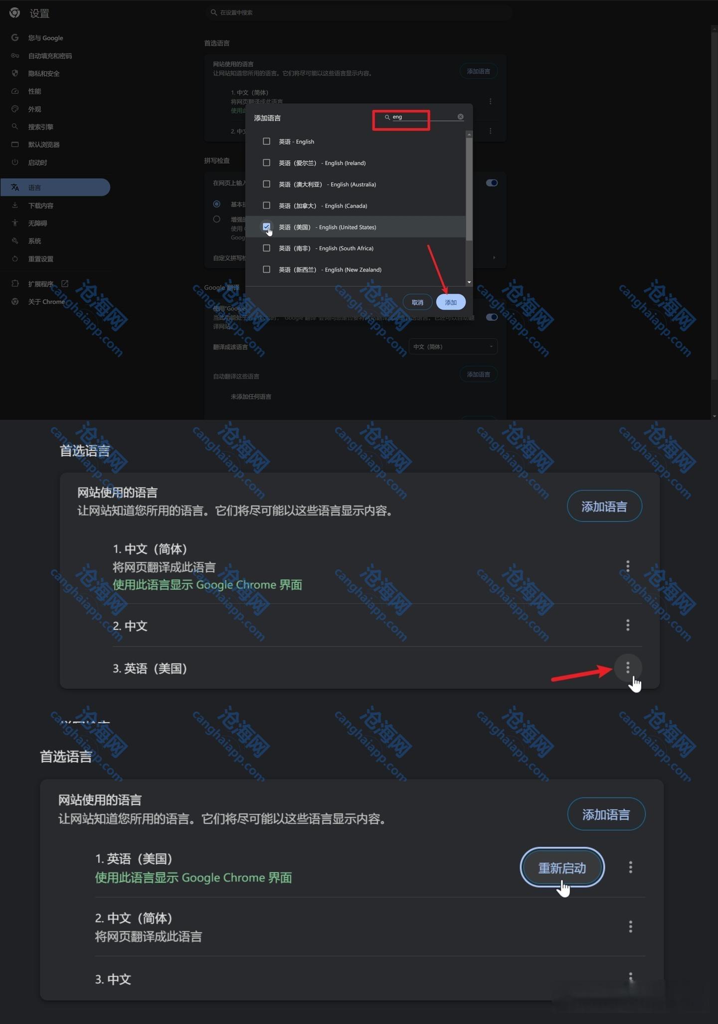 4.选中刚刚添加的英语(美国),设为默认语言,点击重新启动,重启浏览器