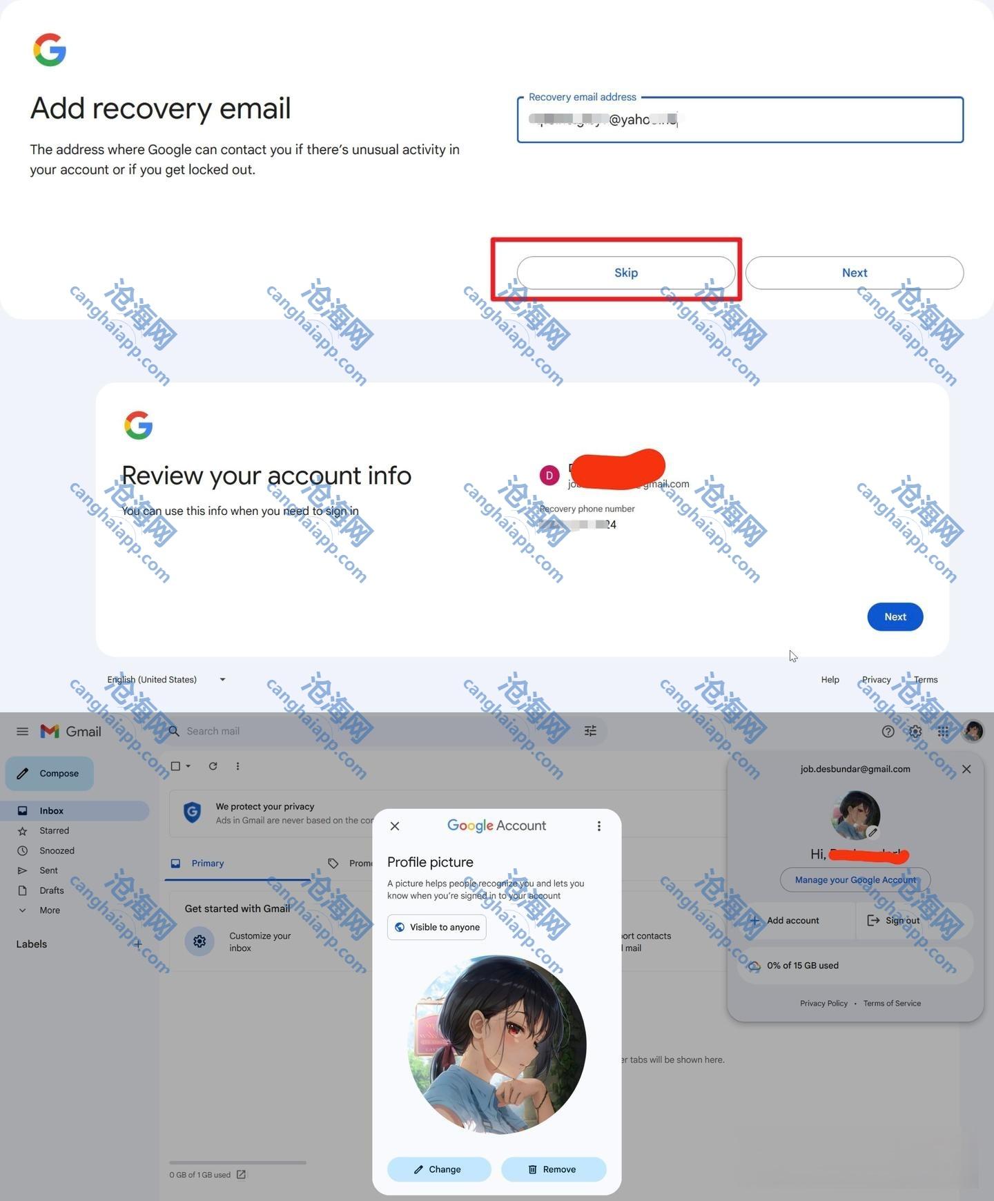 5.填入辅助邮箱可以自行跳过谷歌账户,至此Gmail邮箱注册完成