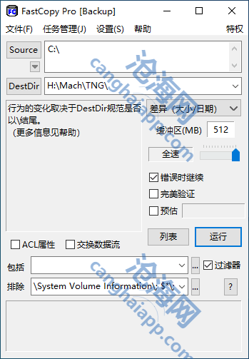打开主程序窗口后,可以发现界面非常简洁,有源目录、目标目录,这些指定文本框一目了然,点击它们可以分别指定相应文件夹。操作方式有七种,分别显示在下拉列表中,默认下为“复制—或重名,则仅复制大小时间不同的文件”。为何复制的快?关键就是在“缓存”了,因此可以根自个电脑配置情况可以调整该值,默认下为32M。另外,在复制过程中可以通过通配符来设定过滤内容。