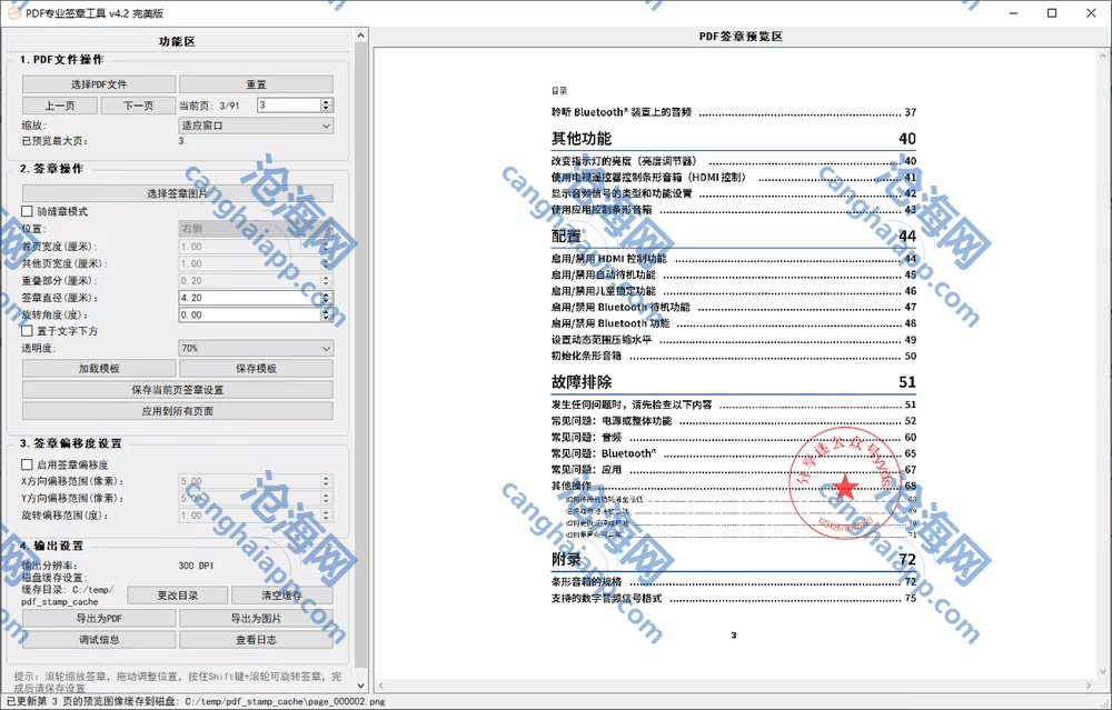 签章可精确控制大小、角度、透明度及图层位置,并提供模板保存和一键应用等便捷功能。输出支持PDF合并文档及JPG分页图片,分辨率可调,满足多种使用场景需求。