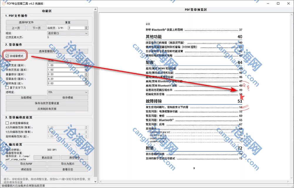 支持各类PDF文件加载与多页预览,提供灵活缩放和快速跳转。其核心签章功能强大,既支持多页批量签章和灵活调整,更具备专业骑缝章模式,可智能计算宽度与重叠度。