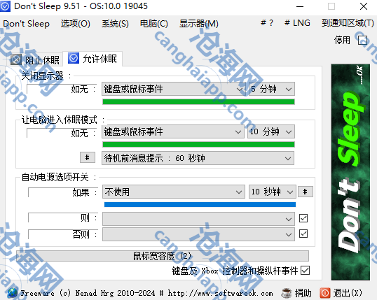 Don’t Sleep 是一款 Windows 电源管理工具,可以防止系统关闭,待机,休眠,关闭和重新启动。特别是当旧程序在 Windows 10、8.1 等上运行时。 这里是新规则更积极的省电功能。不仅如此,它还可以防止注销计算机,禁用监视器或激活屏幕保护程序。除了其名称“Don’t Sleep”所暗示的功能之外,这款工具还配备了一个计时器功能,允许用户移除时间控制限制,或者设定在特定时间后自动关闭计算机。