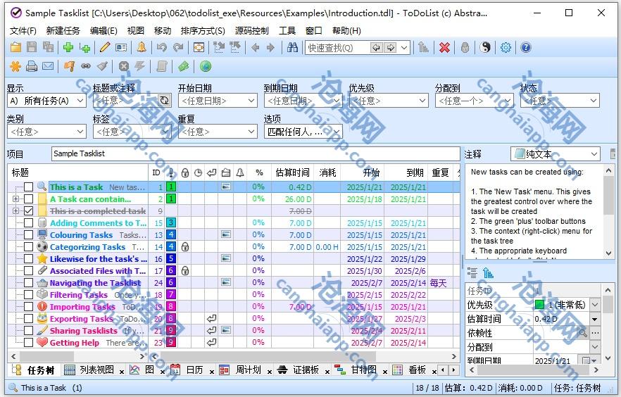 ToDoList 是一款由美国 AbstractSpoon 软件科技团队专注设计与开发出品的开源免费且功能强大的专业级日常工作任务管理器,能够有条不紊地协助办公人员进行模块化组织管理并提高工作效率,支持任务进度管理与任务颜色、优先级等属性操作。具备精悍的任务管理跟踪引擎,支持用户创建层次化结构的任务,将复杂的任务分解为逐个更简单的子任务,直到不需要再进一步的简化为之。